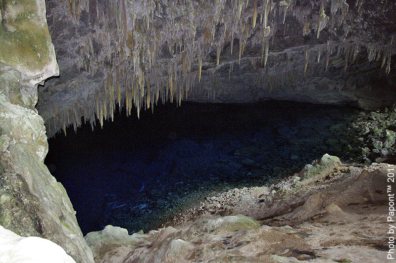 Сюда на дно свет попадает сильно рассеянным. Сталактиты имеют свой привычный белый цвет. Сочетание с синей водой обалденное.